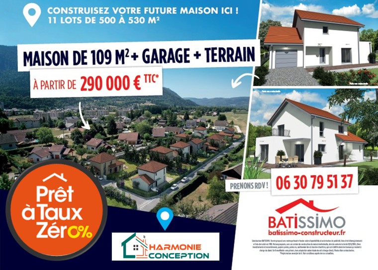 Agence HARMONIE CONCEPTION BATISSIMO VOREPPE. Terrain proposé avec notre partenaire foncier selon disponibilités et autorisation de publicité. Hors droit d’enregistrement et frais de notaire et VRD. Maison proposée, avec un contrat de construction de maison individuelle, dans le cadre de la loi du 19/12/1990, (Hors branchements et raccordements, papiers peints, peintures, revêtement de sol dans les chambres, qui sont chiffrés dans les travaux qui restent à charge du client. Tarif modifiable sans préavis, hors adaptation selon étude de sol à charge client). Photo Non contractuelle.