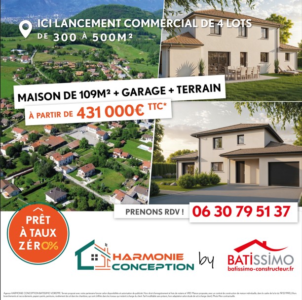 Agence HARMONIE CONCEPTION BATISSIMO VOREPPE. Terrain proposé avec notre partenaire foncier selon disponibilités et autorisation de publicité. Hors droit d’enregistrement et frais de notaire et VRD. Maison proposée, avec un contrat de construction de maison individuelle, dans le cadre de la loi du 19/12/1990, (Hors branchements et raccordements, papiers peints, peintures, revêtement de sol dans les chambres, qui sont chiffrés dans les travaux qui restent à charge du client. Tarif modifiable sans préavis, hors adaptation selon étude de sol à charge client). Photo Non contractuelle.