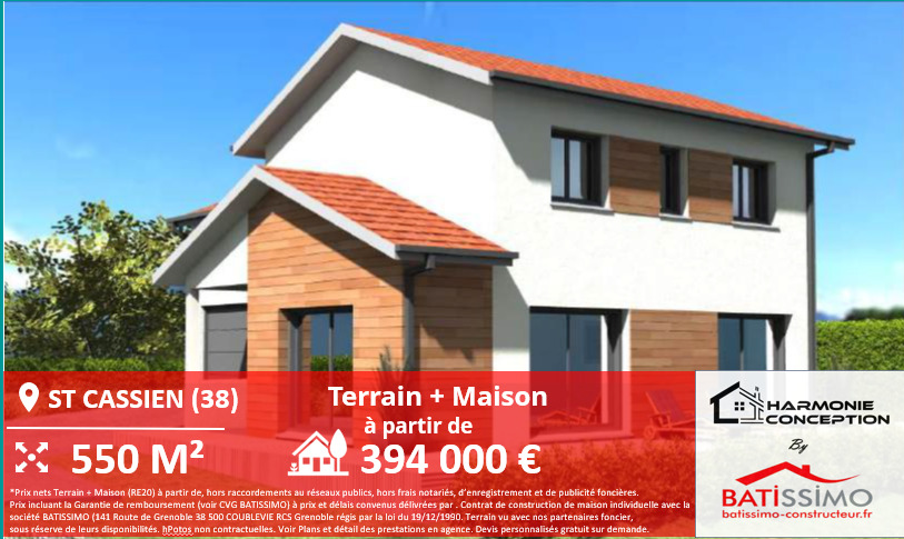 Agence HARMONIE CONCEPTION BATISSIMO VOREPPE. Terrain proposé avec notre partenaire foncier selon disponibilités et autorisation de publicité. Hors droit d’enregistrement et frais de notaire et VRD. Maison proposée, avec un contrat de construction de maison individuelle, dans le cadre de la loi du 19/12/1990, (Hors branchements et raccordements, papiers peints, peintures, revêtement de sol dans les chambres, qui sont chiffrés dans les travaux qui restent à charge du client. Tarif modifiable sans préavis, hors adaptation selon étude de sol à charge client). Photo Non contractuelle.