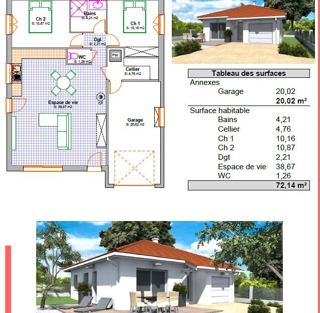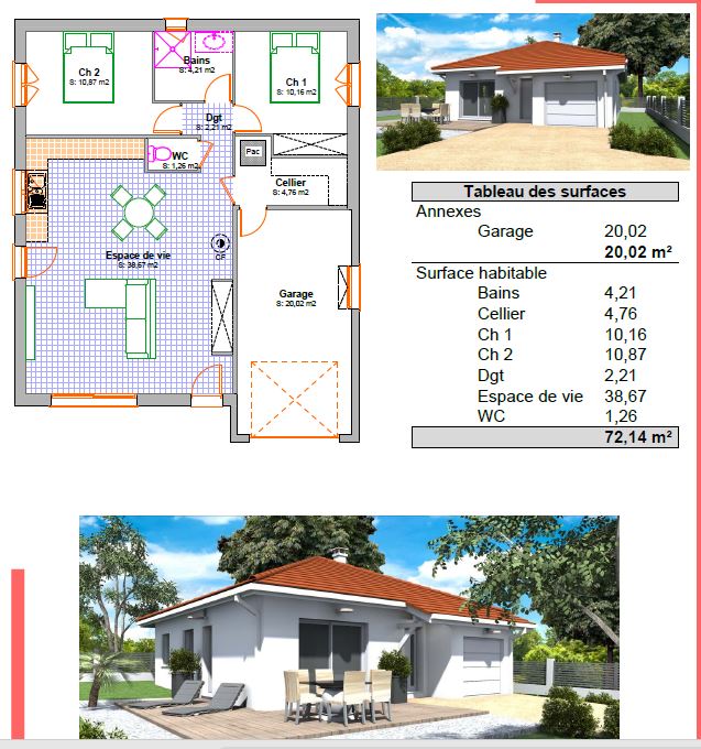Proche de St Etienne de Geoirs, dans un cadre champêtre et calme. Votre future villa PERSONNALISABLE de PLAIN-PIED comprenant un bel espace de vie de 38 m2 avec cuisine ouverte, 2 CHAMBRES , 1 toilette , un cellier et un garage de 20m2.
