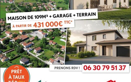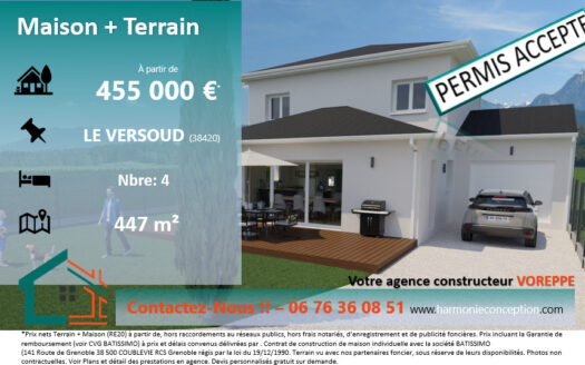 Agence HARMONIE CONCEPTION BATISSIMO VOREPPE. Terrain proposé avec notre partenaire foncier selon disponibilités et autorisation de publicité. Hors droit d’enregistrement et frais de notaire et VRD. Maison proposée, avec un contrat de construction de maison individuelle, dans le cadre de la loi du 19/12/1990, (Hors branchements et raccordements, papiers peints, peintures, revêtement de sol dans les chambres, qui sont chiffrés dans les travaux qui restent à charge du client. Tarif modifiable sans préavis, hors adaptation selon étude de sol à charge client). Photo Non contractuelle.