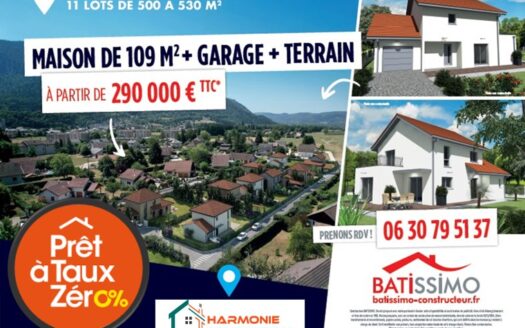 Agence HARMONIE CONCEPTION BATISSIMO VOREPPE. Terrain proposé avec notre partenaire foncier selon disponibilités et autorisation de publicité. Hors droit d’enregistrement et frais de notaire et VRD. Maison proposée, avec un contrat de construction de maison individuelle, dans le cadre de la loi du 19/12/1990, (Hors branchements et raccordements, papiers peints, peintures, revêtement de sol dans les chambres, qui sont chiffrés dans les travaux qui restent à charge du client. Tarif modifiable sans préavis, hors adaptation selon étude de sol à charge client). Photo Non contractuelle.
