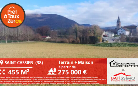 Agence HARMONIE CONCEPTION BATISSIMO VOREPPE. Terrain proposé avec notre partenaire foncier selon disponibilités et autorisation de publicité. Hors droit d’enregistrement et frais de notaire et VRD. Maison proposée, avec un contrat de construction de maison individuelle, dans le cadre de la loi du 19/12/1990, (Hors branchements et raccordements, papiers peints, peintures, revêtement de sol dans les chambres, qui sont chiffrés dans les travaux qui restent à charge du client. Tarif modifiable sans préavis, hors adaptation selon étude de sol à charge client). Photo Non contractuelle.